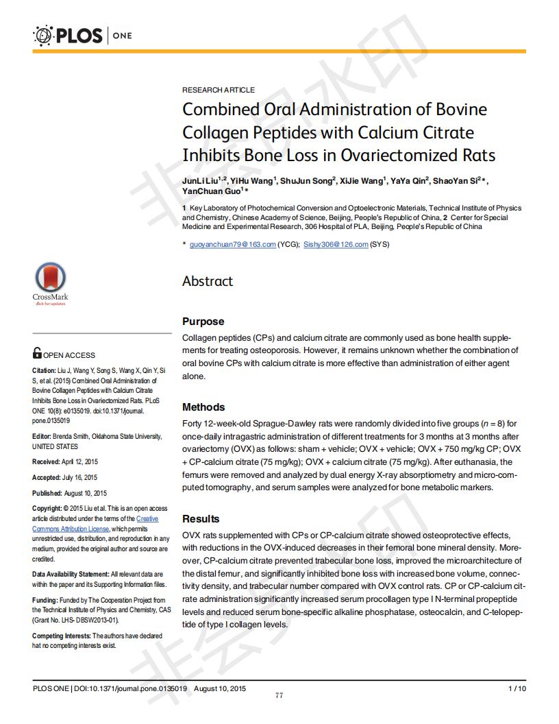 Oral administration of collagen peptide and calcium citrate inhibits bone loss in ovariectomized rat